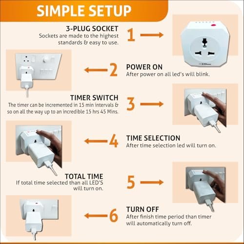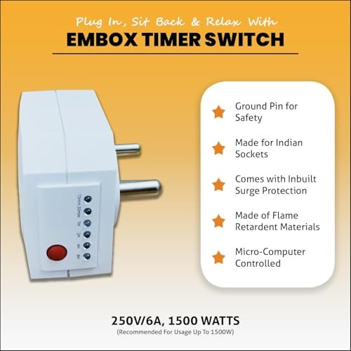 About this item Check Your Electricity Bill With A Smile: Now Missing To Switch Off Your Power Guzzling Equipment Like Common Lights/Balcony Lights, Home Lights, Time Should Be A Worry Of The Past. Our Socket, Which Is An Off Delay Timer, Helps You To Shut Off Power To Devices After A [User] Set Time Period And Save You A Ton Of Money. Best Of All, It Also Extends The Life Of Your Devices Like Mobiles Phones, Tablets & Laptops By Avoiding Overcharging Of Their Batteries. Made For India Standards & Built For Safety: Our Socket/ Timer Switch Comes Fitted With Type-D 3-Pin Plug, Has A Ground Pin And Rated For 250V/5A, Is The Most Commonly Used Standard In Indian Homes. Made Of High-Quality Flame Retardant Materials And Equipped With Surge Protection Our Socket / 3 Pin Plugs Can Be Safely Used With A Variety Of Electronic Devices And Kitchen & Home Appliances. Multiple Devices: Our Socket/Smart Plug/ Battery Charger Switch Can Be Used For A Range Of Devices And Appliances Such As Electric Cookers, Balcony Lights, Garden Lights, Home Lights , Glow Sign Boards, Decorative Lighting, Aquariums Lights , Aquarium Accessories And More Impressive, Right? Operation Guide: The Timer Can Be Incremented In 15 Min Intervals – 15 Mins, 30 Mins, 45 Mins, 1 Hr, 1 Hr 15 Mins And So On All The Way Up To An Incredible 15 Hrs 45 Mins. The Logic Is – With Every Press 15 Mins Is Added And Total Time Is Addition Of All The Turned On Leds. You Have To Keep It Pressed For Increments To Tick Quickly. The Timer Has To Be Reset After Every Use Or In The Event Of A Power Outage During Usage. Warranty: Our Conserve Sockets Are Made To The Highest Standards. Embox 6 Months Replacement Warranty For Any Quality-Related Issues Means We’Ve Got You Covered! Contact Us For An Easy And Fast Replacement.